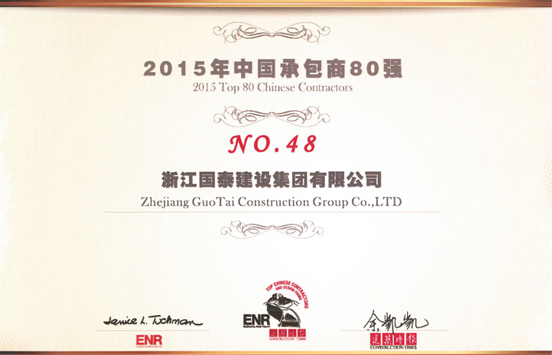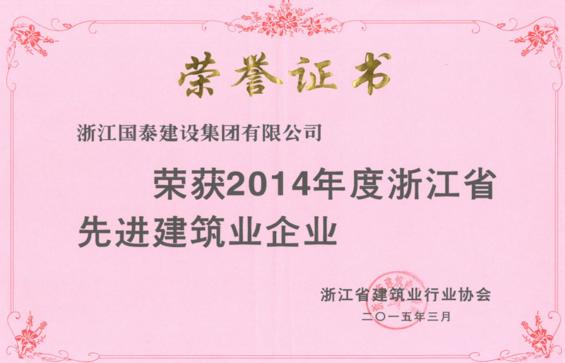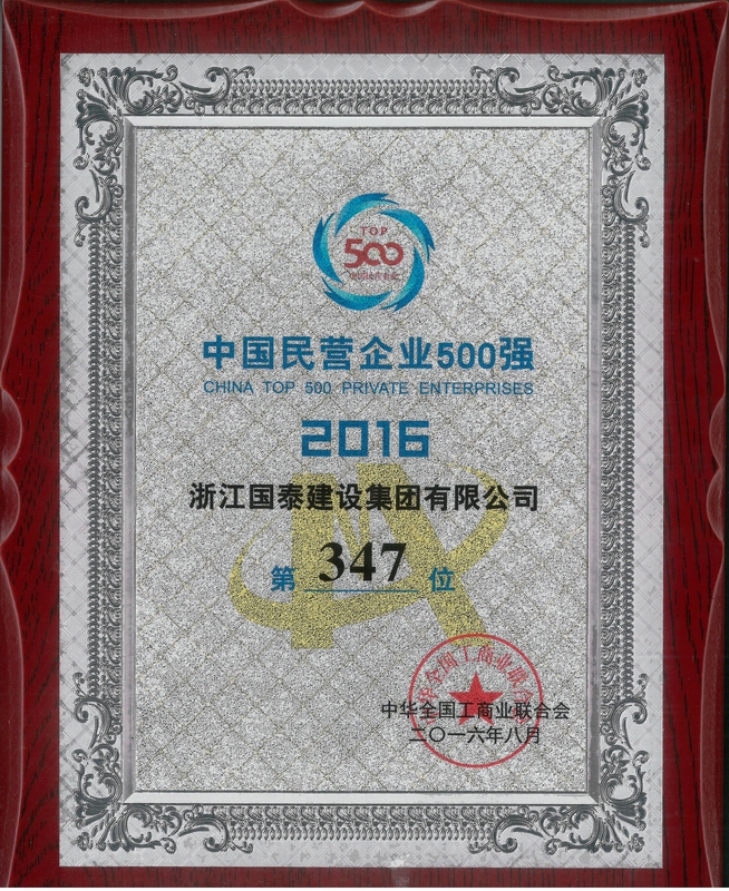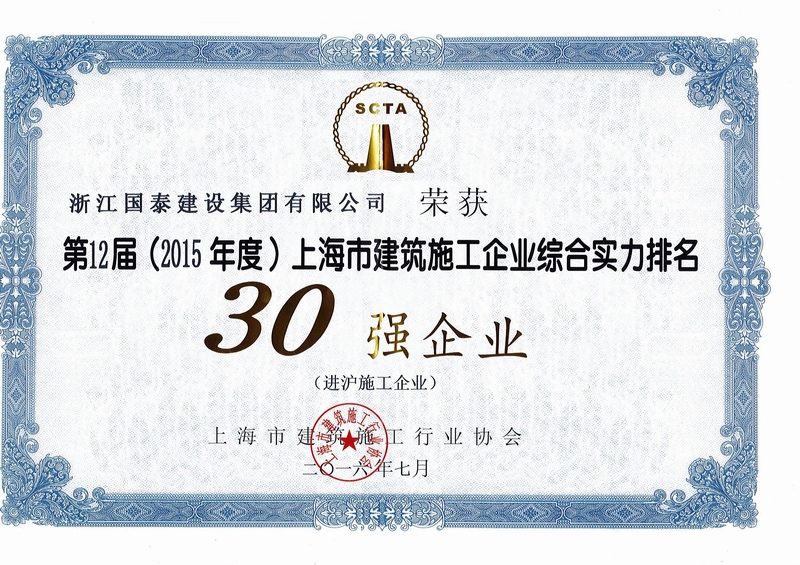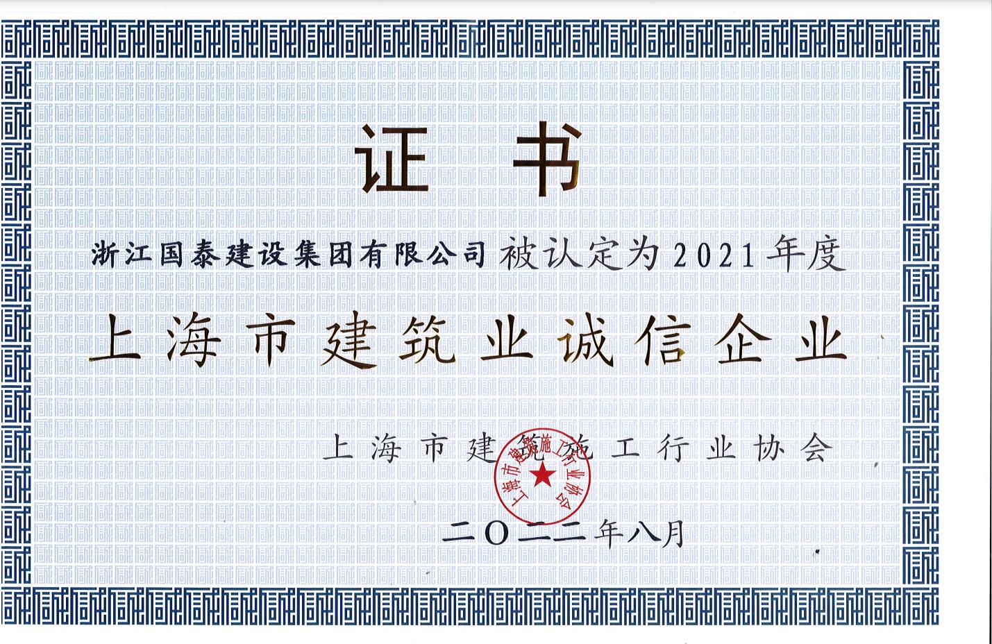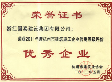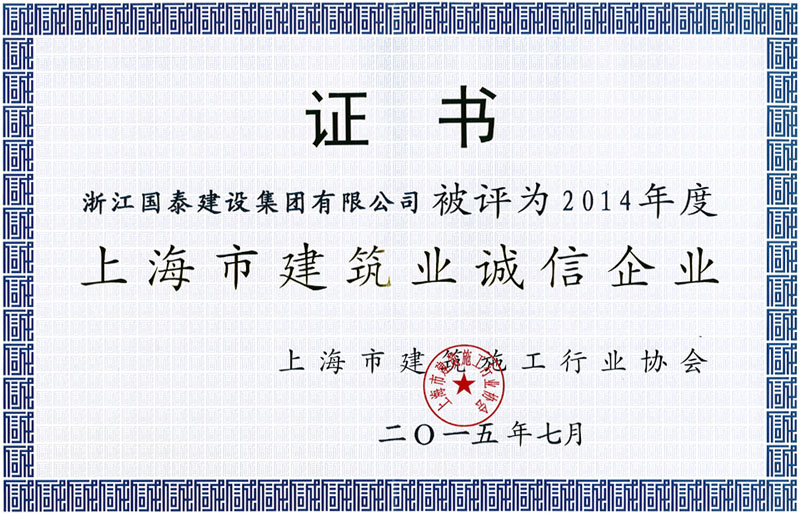 浙江省百强民营企业,浙江省建筑重点骨干企业,浙江省先进建筑施工企业,浙江省用户满意施工企业,浙江省首批诚信企业,杭州市百强企国泰产业、建设银行"AAA" 级信用企业,连续十八年被评为上海市外省市进沪施工企业工程质量、施工安全、经营行为、队伍管理、文明施工和科技进步等实绩综合考评优秀企业。