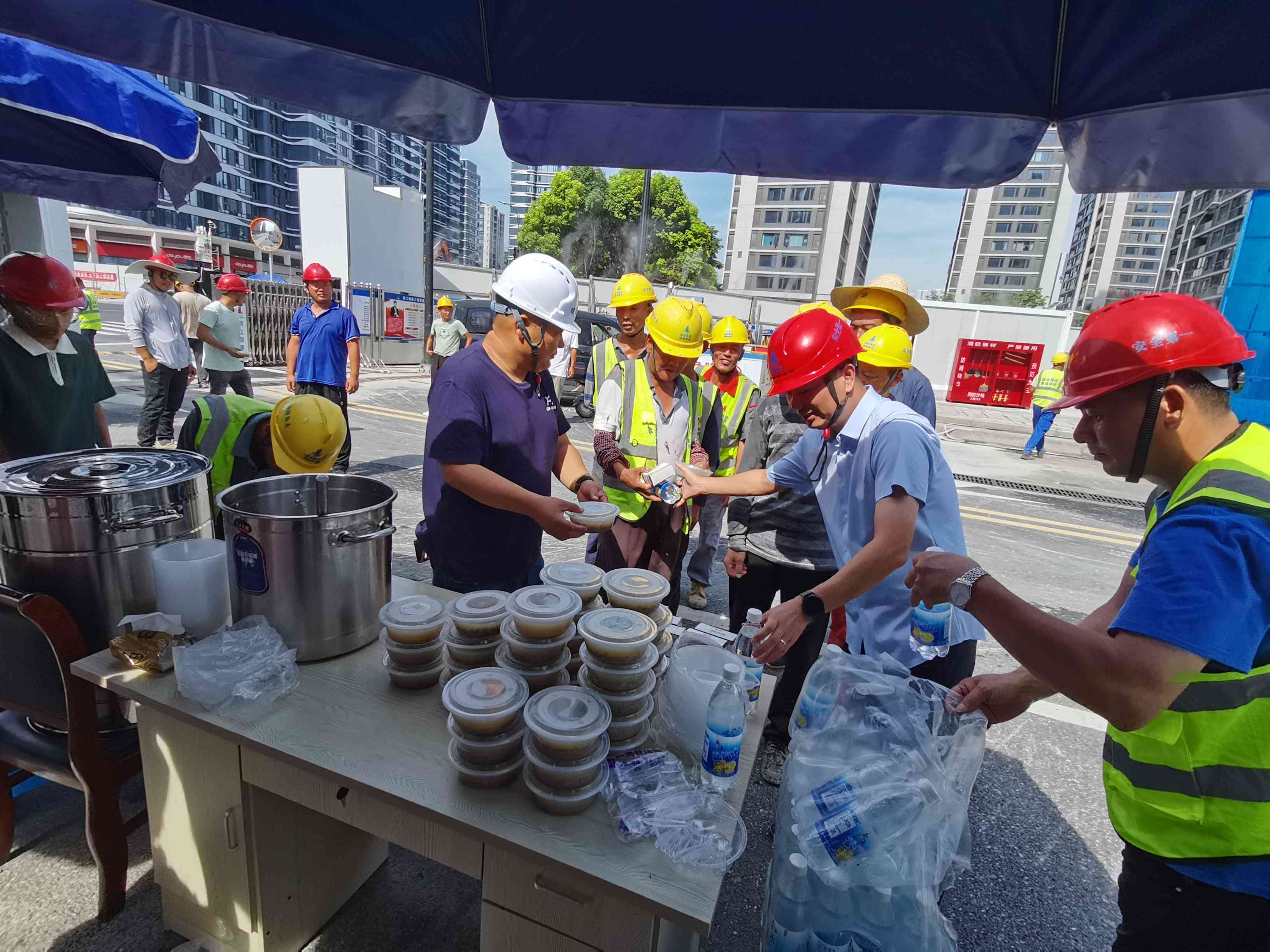 积极改善现场作业环境,通过采取配备大功率排风扇、洒水降温等措施进行降温处置;组织夏令慰问,加强对职工的关怀。杭州地铁15号线6标等项目设置清凉驿站,配备防暑降温物资并发放绿豆汤、凉茶、藿香正气液等;同时定期邀请医生对职工进行健康检查,密切关注作业人员身体状况,保障健康安全。