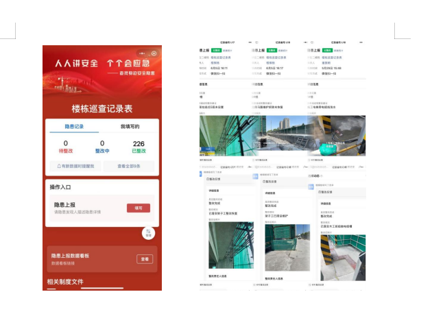 1、智慧工地 “助建设”:无人驾驶施工升降机、高支模预警系统、安全防护预警系统、“安全卫生” 小程序协同赋能。无人驾驶施工升降机通过精准定位与智能调度,实现人员物资高效运输;高支模预警系统实时监测支架沉降、位移等数据,超出阈值立即报警;安全防护采用门磁式预警系统对临边洞口、危险作业区域进行全天候监控,一旦有人员违规进入便发出警示;“安全卫生”小程序专注于安全隐患上报功能,工人可通过拍照、文字描述方式一键上传现场安全问题,系统自动同步至管理人员终端,便于快速跟进处理,形成隐患发现、上报、处置的闭环管理。