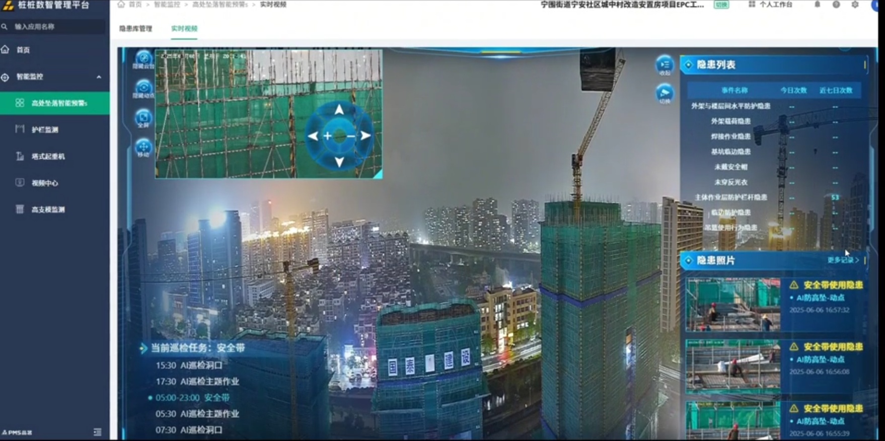 2、鹰眼系统 “查安全”:依托高清摄像头与智能分析算法,构建覆盖整个施工现场的无死角监控网络。从塔吊运转的每一个角度、脚手架搭设的每一处节点,到工人是否规范佩戴安全帽、动火作业是否符合流程,都能被精准捕捉。系统可自动识别违规行为并及时推送至管理人员终端,成为时刻警惕的 “安全哨兵”。