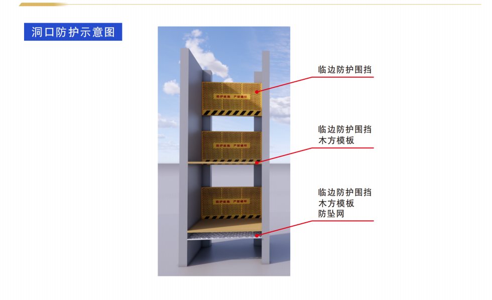 3、洞口防护 “三强化”:以定型化围护、模板隔离、防坠网为核心,筑牢洞口安全屏障。定型化围护采用统一标准的防护栏,设置于电梯井口、预留洞口等位置,栏高、间距严格符合规范,同时配备电子报警仪器;模板隔离针对较大洞口,采用坚固的模板进行覆盖,并做好固定处理,防止模板移位或坍塌;防坠网在洞口下方或内侧张设,选用高强度阻燃材料,确保网目密度和承重能力达标,三重防护措施协同作用,有效防范高处坠落事故。