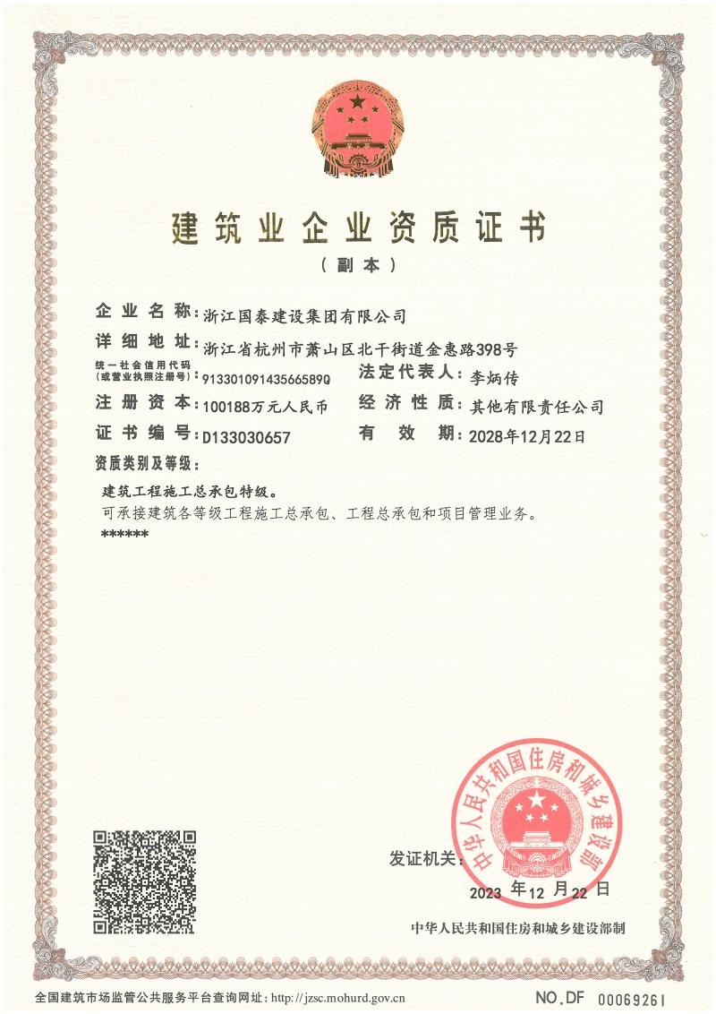 公司系国家房屋建筑工程施工总承包特级企业,具备设备安装、装饰装修、地基与基础三个专项壹级资质、并拥有海外工程承包经营资质。