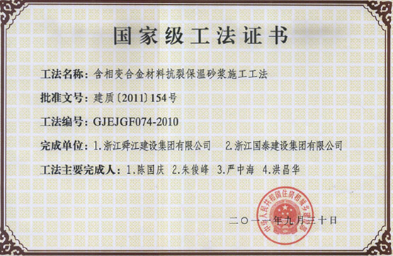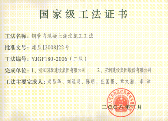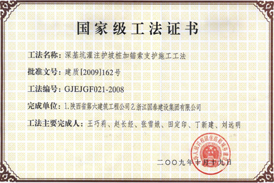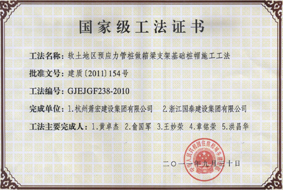 公司拥有"钢管内混凝土浇筑施工工法"、"深基坑灌注护坡桩加锚索施工工法"、"含相变合金材料抗裂保温砂浆施工工法"、"软土地区预应力管桩做箱"、"梁支架基础桩帽施工工法"等二十多项国家级、省级工法技术。