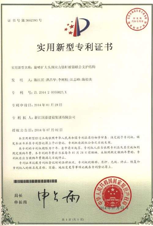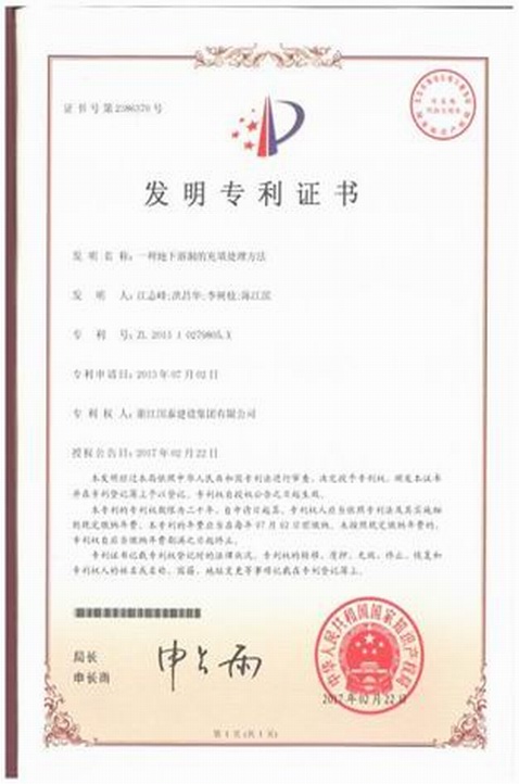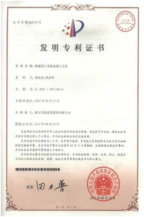 公司拥有“深基坑围护桩的支撑件”、“快捷挖土系统及挖土方法”、“欧式建筑混凝土雕花装饰造型施工装置及其施工方法”、“一种地下溶洞的充填处理方法”等四十多项发明、实用新型专利。公司在软土地基技术方面的"土工合成材料加筋软基的研究"、"广义复合地基理论研究及工程应用"等项目荣获省级科学技术进步奖。